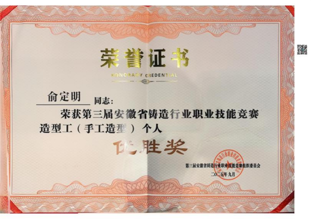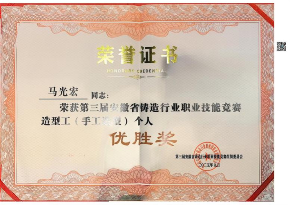 2025年09月28日,蕪湖久弘重工股份有限公司,在第三屆安徽省鑄造行業(yè)職業(yè)技能競(jìng)賽中,三位選手分別榮獲三等獎(jiǎng)、優(yōu)勝獎(jiǎng)。